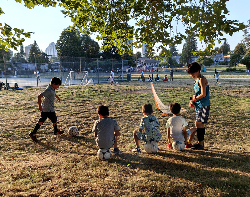 我沿著公園邊緣的步道散步,走了一圈下來,發(fā)現(xiàn)公園既沒有大門,也沒有圍欄和明顯的標志性建筑物,只是僅僅在道路旁邊的草坪上立著一塊不起眼的牌子,上面寫著Ernie Winch Park,即溫奇公園。我想,還有什么標志比得上這三四十畝的綠色生態(tài)公園更引人注目呢?不遠處,只見兩撥孩子分別圍著兩名教練抑或家長在踢足球,眼前這二三十多名孩子的年齡大至為七八歲,烈日下個個汗流浹背、生龍活虎地穿梭馳騁在球場上。緊挨著的兩個網(wǎng)球場又是另一番景象,一名八九歲的女孩與她的父親在打網(wǎng)球,女孩揮舞著球拍,動作嫻熟,扣球有力,儼然一位小專業(yè)運動員。一旁還有一對年輕夫妻陪著一個大約只有二歲左右的男孩玩足球,更有甚者的是,只見一個一歲多的男孩穿著尿布濕在音樂噴水廣場上被淋的濕漉漉的來回穿梭。此外,還有打排球、打乒乓球的,一些年齡更小的幼兒在家長的照看下玩滑滑梯、蕩秋千等。也有溜狗的、閑聊的、躺在草坪上聽音樂的。我的外孫和外孫女則與他的另一個同學騎著自行車在草坪上你追我趕,玩得不亦樂乎。在休息區(qū),一群大人和小孩圍著一個臨時攤點購物,我移步駐足觀看,原來是幾位母親分別帶著她們的孩子在賣Chips、Pocky等零食,一位母親告訴我:“從小培養(yǎng)孩子自食其力的能力及商業(yè)意識很重要,孩子有了健康的身體和商業(yè)頭腦,長大后就會有較好的發(fā)展前景。”讓我大跌眼鏡的是,這4名孩子中,年齡最小的居然只有6歲,最大的也才8歲,而這種商業(yè)體驗兩年前就開始了。